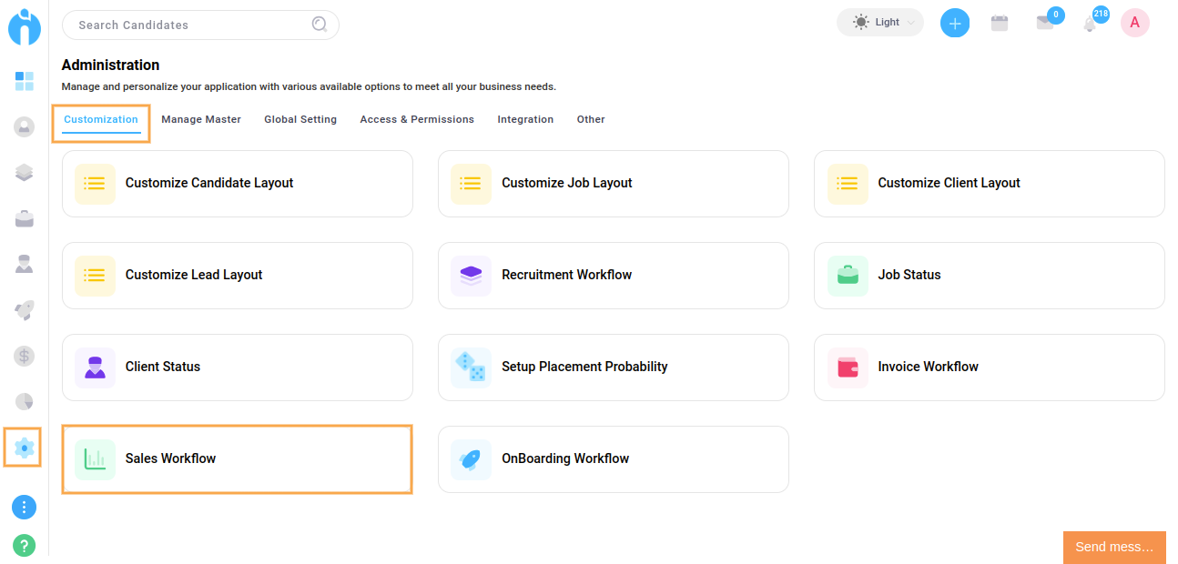 To customize the Lead status, click on the "Admin" Module on the left-hand side of the menu, go to the customization tab, and select the "Sales Workflow" option.