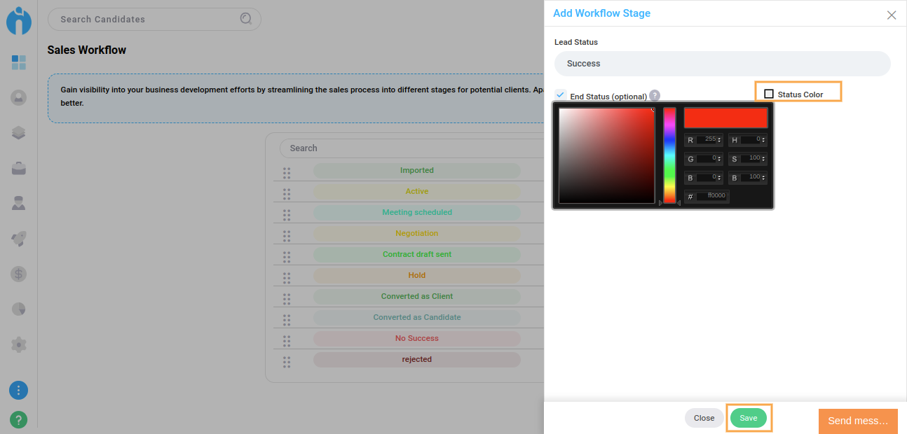 Step 4: Select the preferred colour by clicking the colour shade that helps to identify the Lead status with the colour code. Click on the Save button below to create a new lead status.