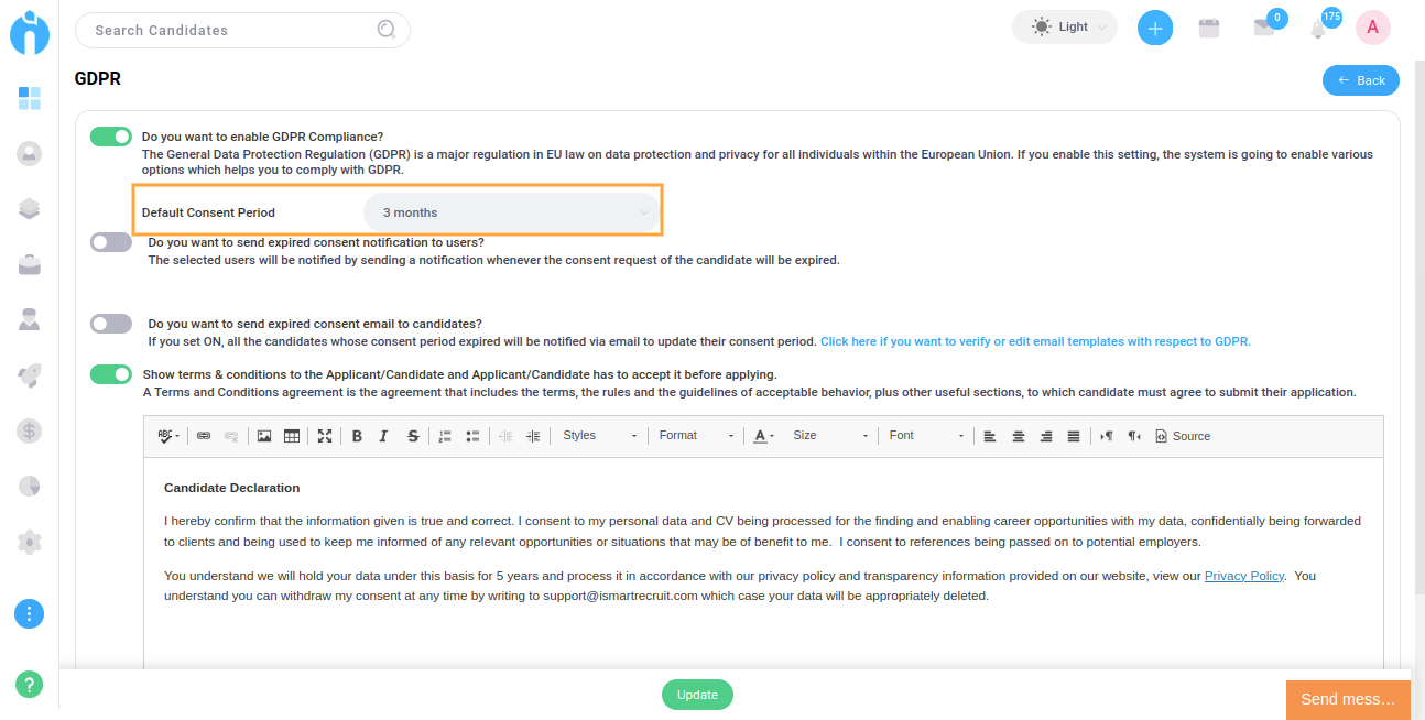 Set a flag to ON to enable GDPR Compliance and select the consent period from the drop-down to set for the Applicant/Candidate as per your requirement. By default, it will be selected for 3 months.