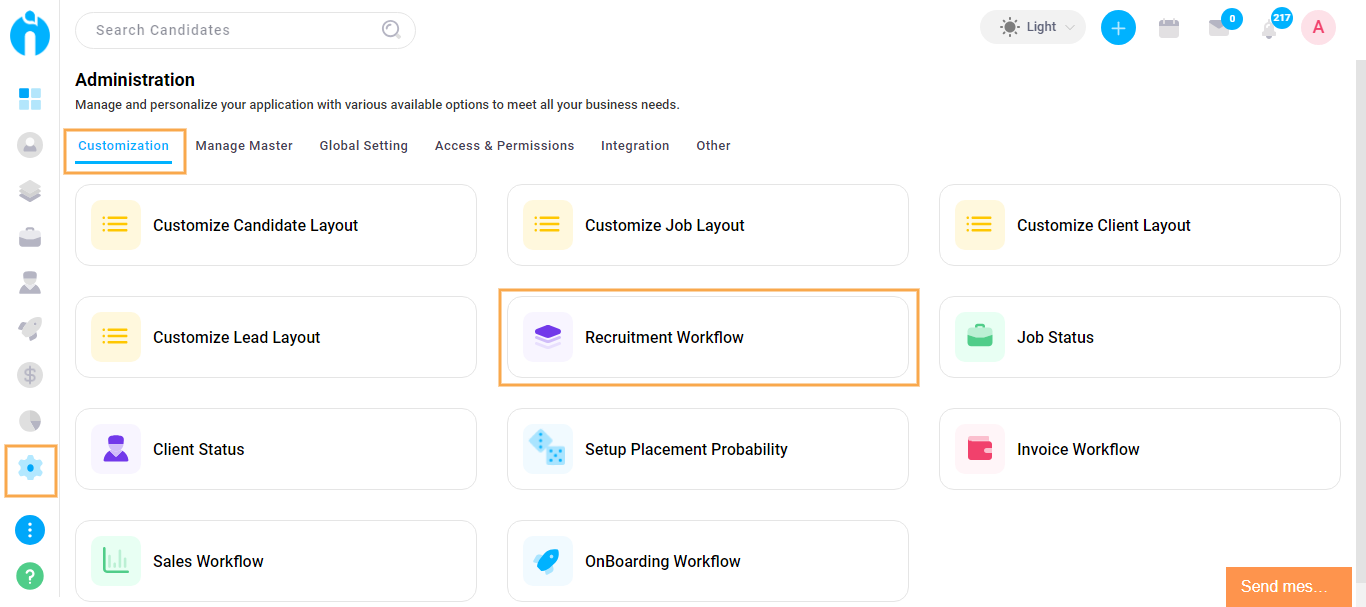Step 1: Click on the "Admin" Module, from the left-hand side of the menu. Open the Customization tab and then go to the Recruitment Workflow option.