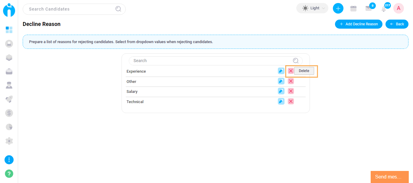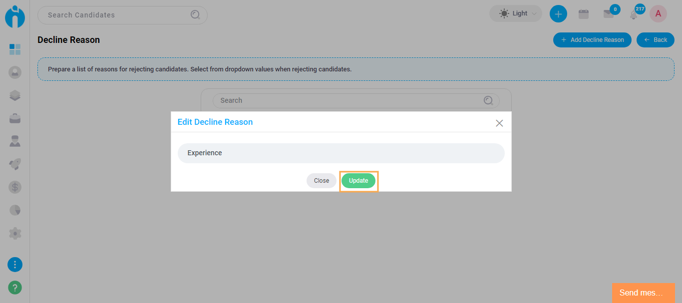 After you click on the edit icon a pop-up box will appear where you can edit the decline reason of candidate status and click on the update button below to update the status.
