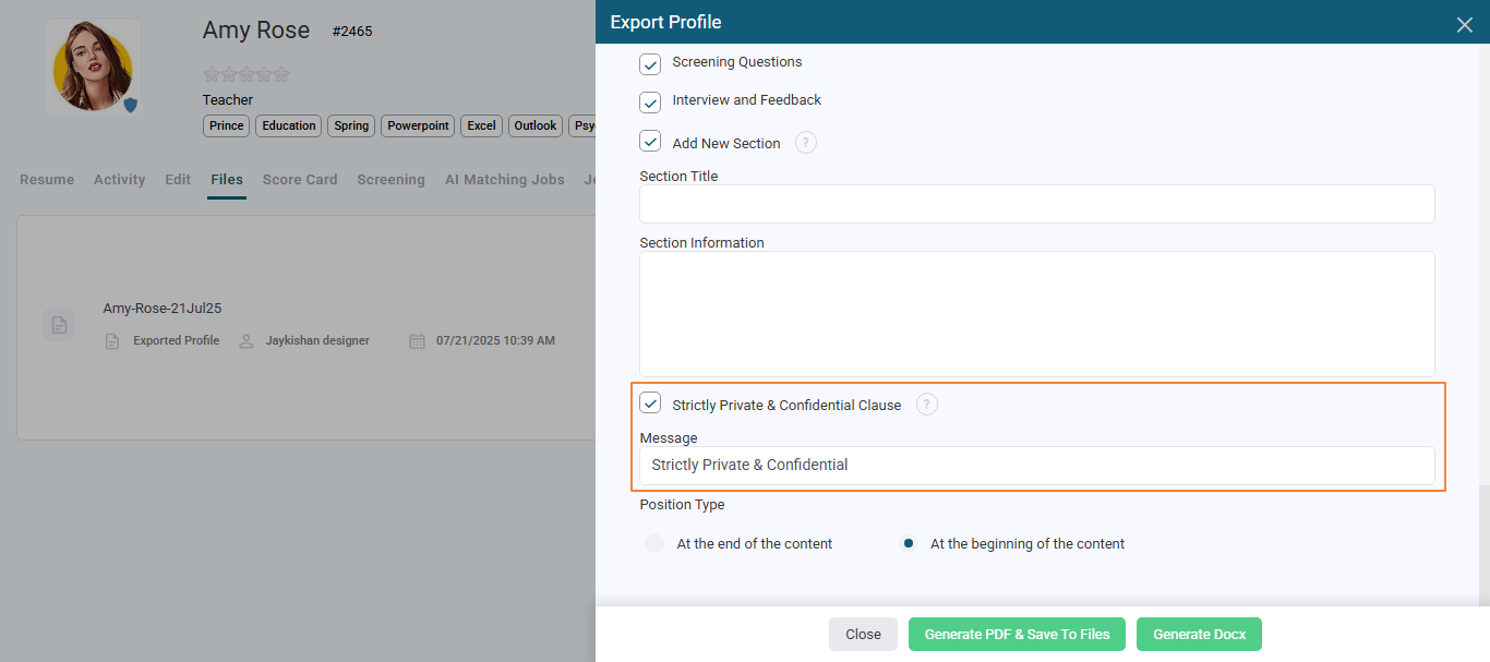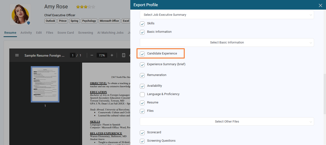 Work Experience is now also included in the Export Profile feature (PDF export from Candidate View).