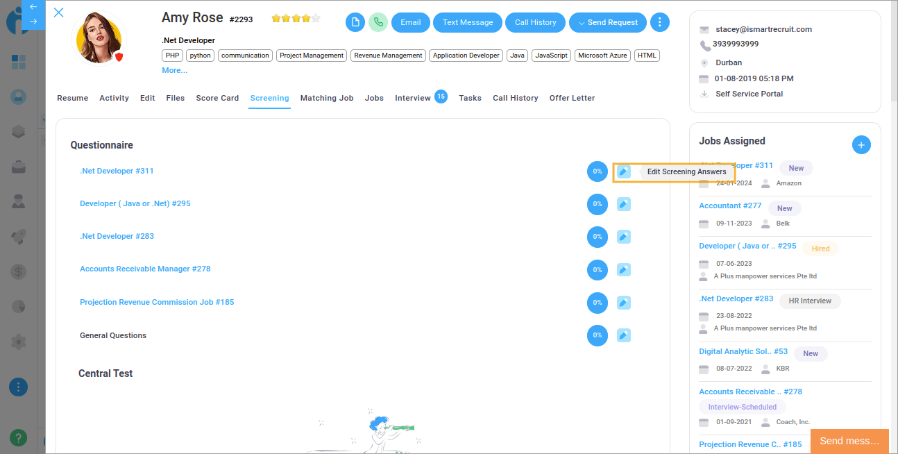 Step 2: Open the candidate profile and click on the Screening tab in the Candidate view dialogue box.