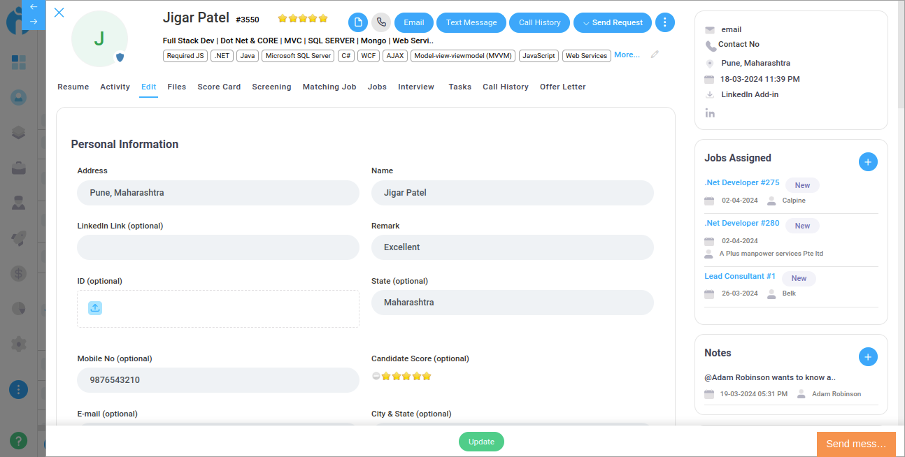 Update the candidate information to keep your Candidate database updated regularly. As and when information related to Candidates changes, you can simply edit the details within the Candidate form.