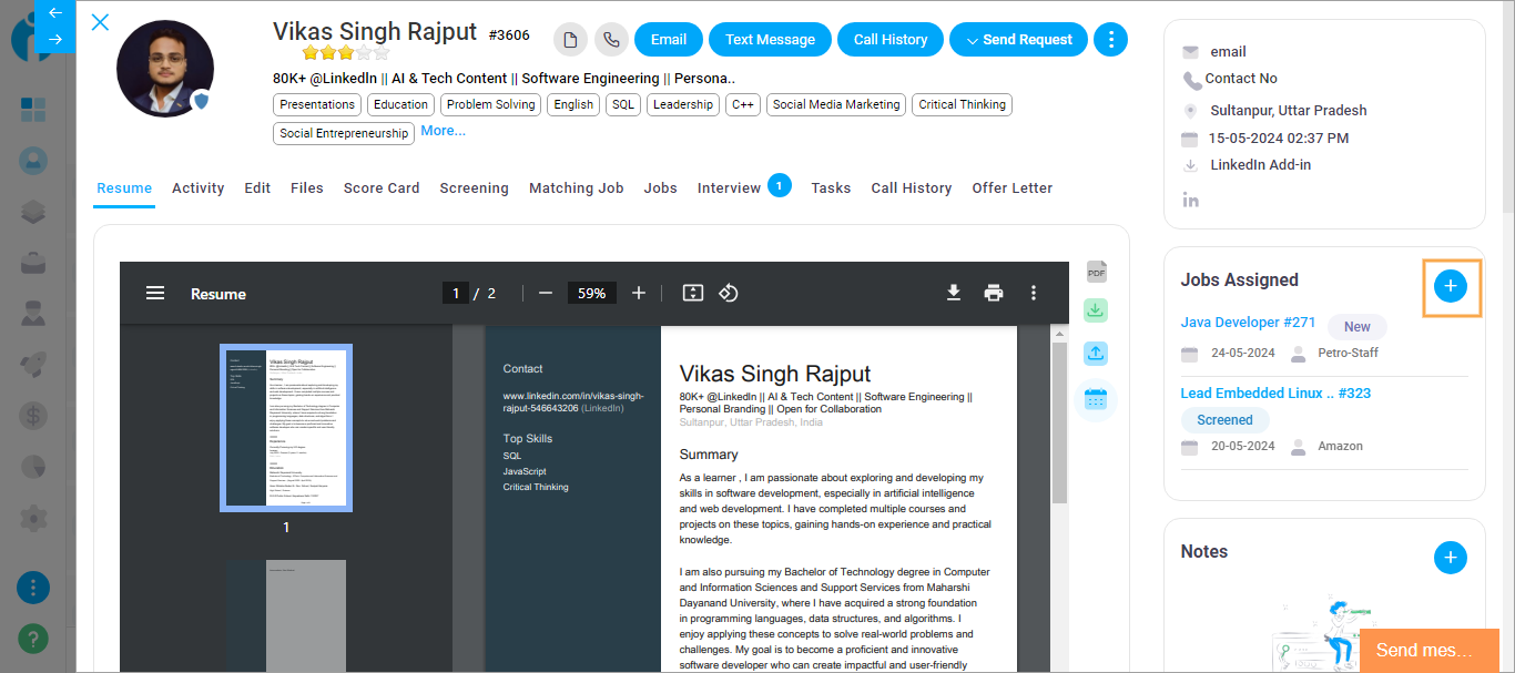 You can open a Candidate View Dialogue box by clicking on the Candidate name from the Candidate Screen. You will see the option to Assign a Job on the right-hand side. Click on it, and a list of Jobs will appear. Click on the "+" icon.