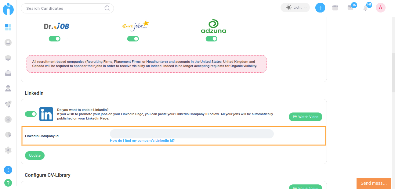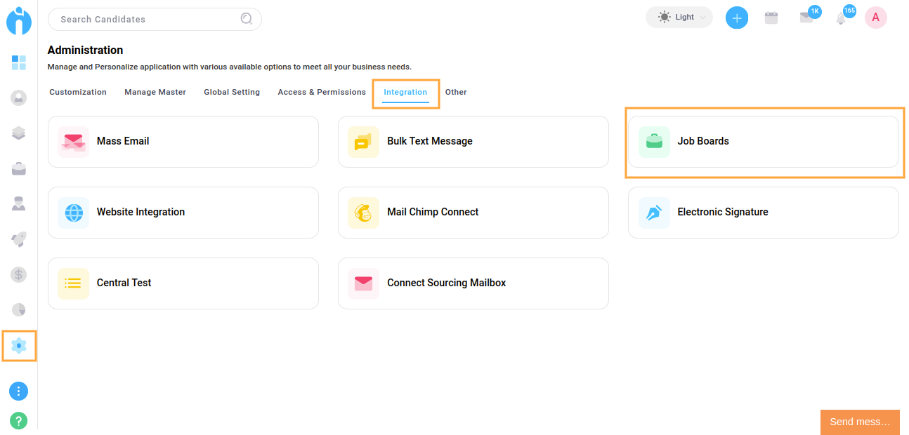 To activate Job boards that suit your geography the best, you can go to the Integration option available in the Admin section.
