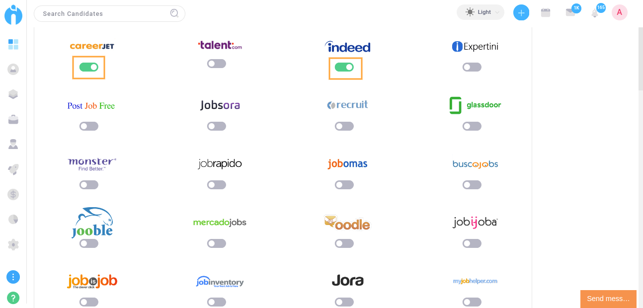 Click on the Job Board menu and you can see the list of Job boards. Just turn ON the buttons for the Job boards where you would like to promote your Jobs. The button will turn Green once it is turned ON. This setting is common across all the Jobs, so all your Active Jobs will automatically be promoted on the selected Job boards.